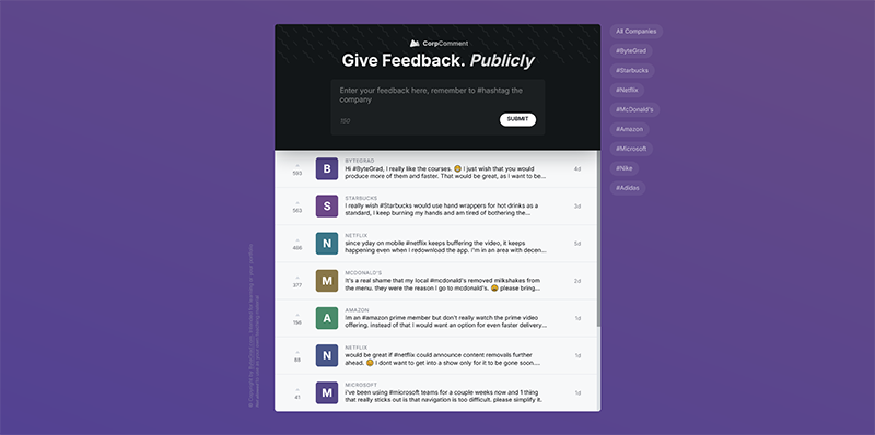 Dit is een app gebouwd aan de hand van de Professional JavaScript cursus van ByteGrad. CorpComment is een platform gebouwd met JavaScript. Gebruikers kunnen opmerkingen achterlaten over bedrijven met behulp van hashtags. Dit maakt eenvoudige categorisatie en zoeken van opmerkingen mogelijk. Gebruikers kunnen hun ervaringen, feedback en meningen over verschillende bedrijven delen, waardoor anderen weloverwogen beslissingen kunnen nemen. De app ondersteunt realtime updates en toont trending hashtags gerelateerd aan bedrijven.